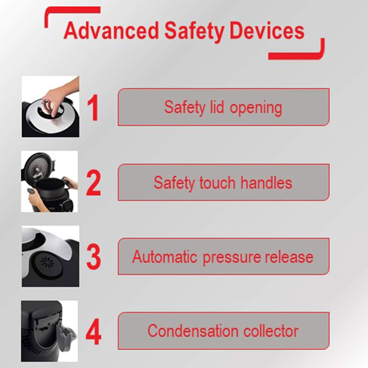 تفال کوک۴می (Tefal Cook4me) زودپز دیجیتالی تکظرفی است که به عنوان شریک آشپزی شخصی شما عمل میکند! کافیست روی صفحه کلیک کنید و یکی از ۱۰۰ دستور پخت داخلی – که بیش از ۵۰ مورد از آنها را میتوان در کمتر از ۱۵ دقیقه* پخت – را انتخاب کنید و راهنمای گام به گام نمایش داده شده روی صفحه نمایش دیجیتال یا حتی روی تلفن خود را با اتصال بلوتوث دنبال کنید! همچنین میتوانید برنامه تفال را دانلود کنید و به بیش از ۲۰۰ دستور پخت اضافی و بسیاری از ویژگیهای دیگر، مانند «لیست خرید» و «در یخچال من» دسترسی پیدا کنید. همچنین میتوانید با دانلود دستور العملهای اضافی از برنامه به دستگاه خود برای راهنمایی گام به گام، دستگاه خود را ارتقا دهید. به لطف زودپز که به طور طبیعی مواد معدنی و مواد مغذی بیشتری را نسبت به پخت سنتی حفظ میکند، میتوانید در کمترین زمان یک وعده غذایی سالم کامل بپزید. همچنین میتوانید یکی از حالتهای دستی شامل زودپز، بخارپز کردن، قهوهای کردن، آرامپز کردن، پخت ملایم یا گرم نگه داشتن را انتخاب کنید، یا یک ماده خاص را انتخاب کنید و کوک۴می آن را به طور کامل برای شما میپزد! شروع پخت خود را تا ۱۵ ساعت بعد به تعویق بیندازید و از حالت گرم نگه داشتن خودکار لذت ببرید، بنابراین غذای شما هر زمان که بخواهید آماده است! به لطف تنظیم خودکار فشار و دما و ویژگیهای ایمنی مختلف مانند تخلیه خودکار فشار، میتوانید زمان بیشتری را بدون نگرانی در کنار عزیزانتان بگذرانید. ظرفیت بزرگ 6 لیتری آن برای حداکثر شش وعده، آن را به گزینهای مناسب برای خانواده یا برای پخت و پز دستهای تبدیل میکند. از همه بهتر، کاسه و سبد بخارپز قابل شستشو در ماشین ظرفشویی هستند.